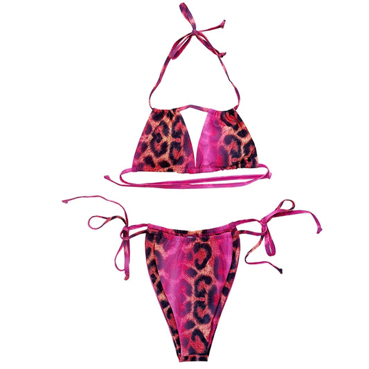 New 2023 Hot Girls Wear Leopard Printed Split Swimsuit Women Sexy Lace-up Swimwear Two Pieces Pink Bikini