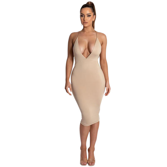 New Arrival Plunge Neck Dress Backless Bodycon Satin Halter Lining Winter Party Club Women Casual Dress