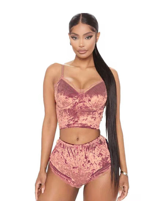 New Arrival Lace Velvet Lingerie Two Pieces Women Pajama Set Nightwear Valentine's Day Lingerie Sets