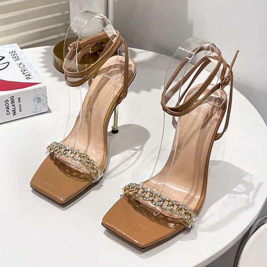 NEW Sexy Summer Fashion Sewing PVC transparent Chain Crystal Shallow BlingCross-Tied Shoes Sweet Thin Heels Women Sandals