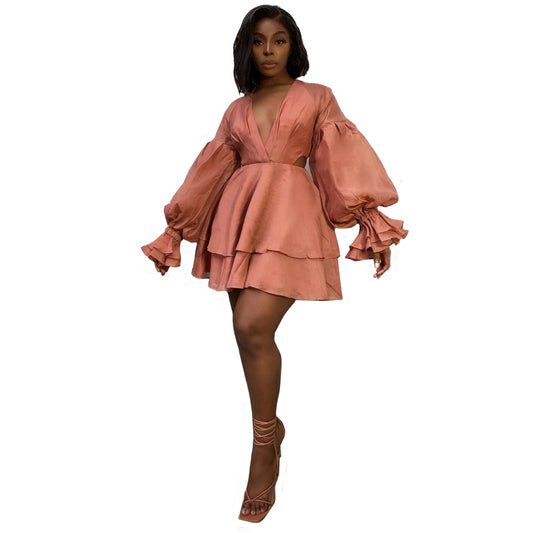 New Women's Fashion V-neck Lantern Sleeve Wave Dress