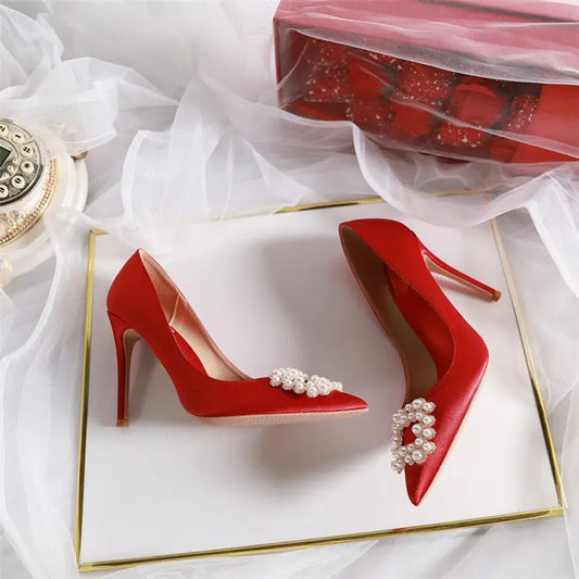 Pearl Pointed-toe Red High Heel Pumps Women's Stiletto Heel White Main Wedding Dress Bridal Wedding Shoes