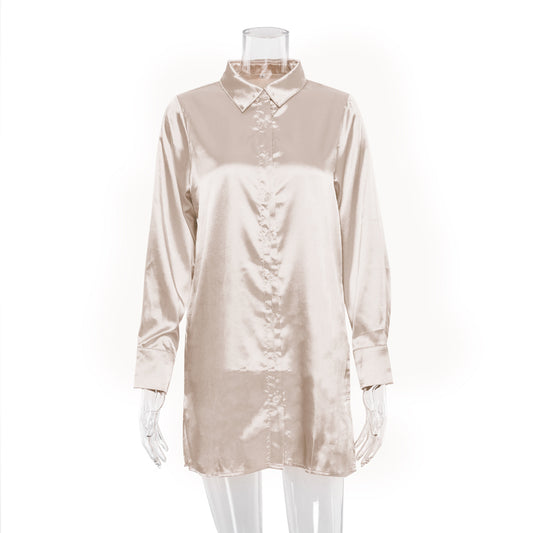 Satin Women's Shirt Polo Collar Elegant Office Lady Shirts Women Tops Spring Summer Irregular Hem Long Sleeve Top Female